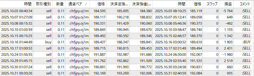 10月のCHFJPYは、またまたOANDAが他社がエントリーしなかった3日のトレードに手を出し-5,764円と、これさえなければ久々のトップだったのですが