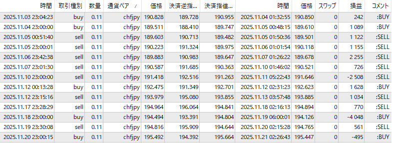 CHFJPYはXMTradingと楽天FXが強い傾向です。
