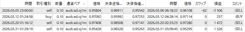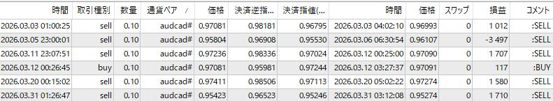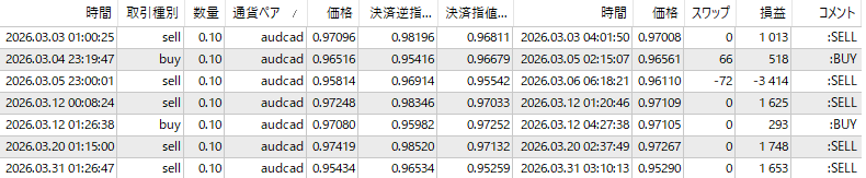 AUDCAD取引状況ですが、近年取引回数が激減してましたが、3月はThreeTraderで7回と、まあまあな取引回数でした。